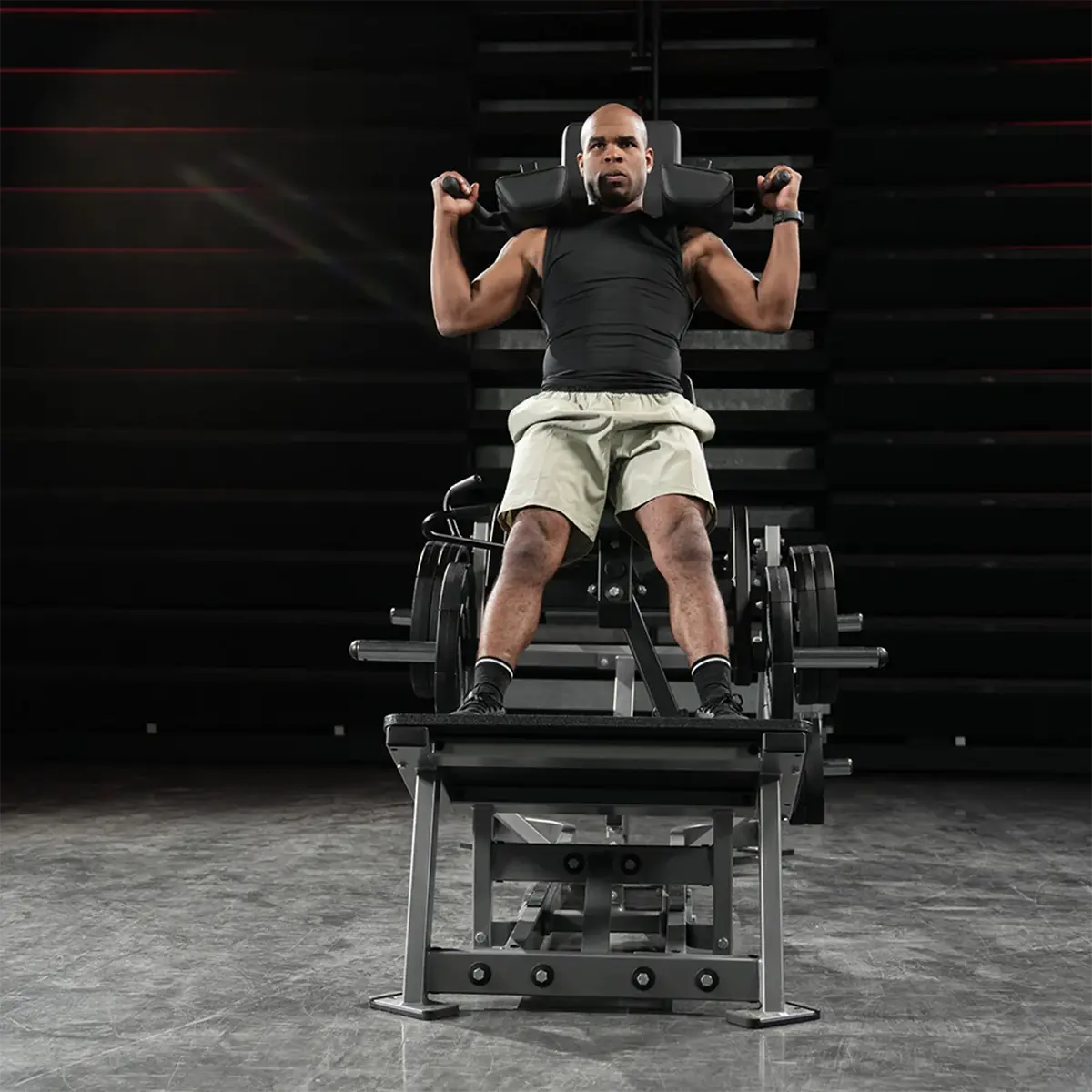 The large platform also makes it useful for users who prefer different stance positions during training. With support for narrow, wide, or staggered foot placement, the machine offers flexibility in setup while keeping the exercise focused on controlled, repeatable squat training.
